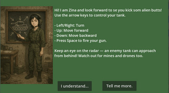 Aliens are invading your country. Control your tank and destroy enemy tanks, flying saucers, and drones. If you eliminate enough of them, you win. This tank game is easy to play. Watch where the enemies are on the radar and use the arrow keys to move and aim. Use space bar to fire.